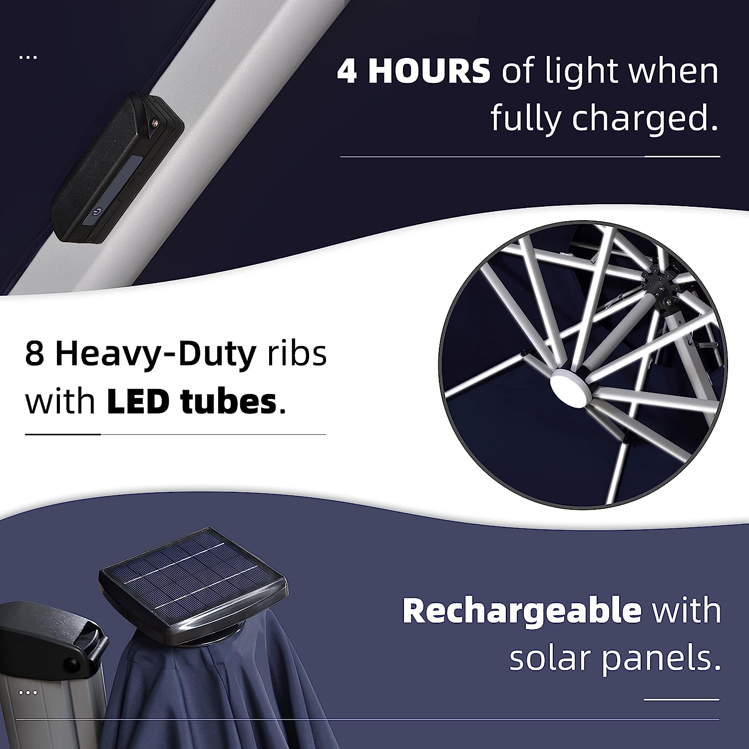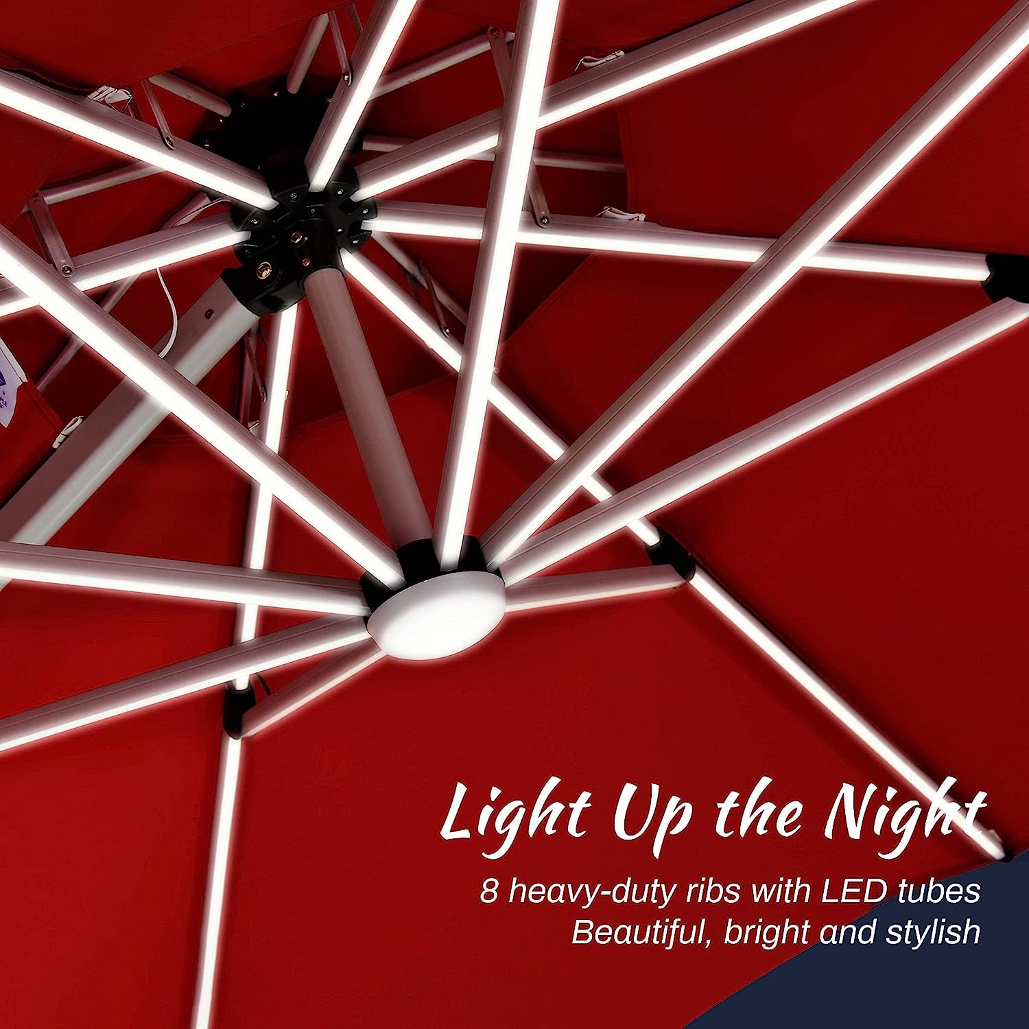 - All-aluminum umbrella bones and 8 HEAVY-DUTY RIBS with LED LIGHT TUBES. anti-oxidation spray painted. maintain a long period life
