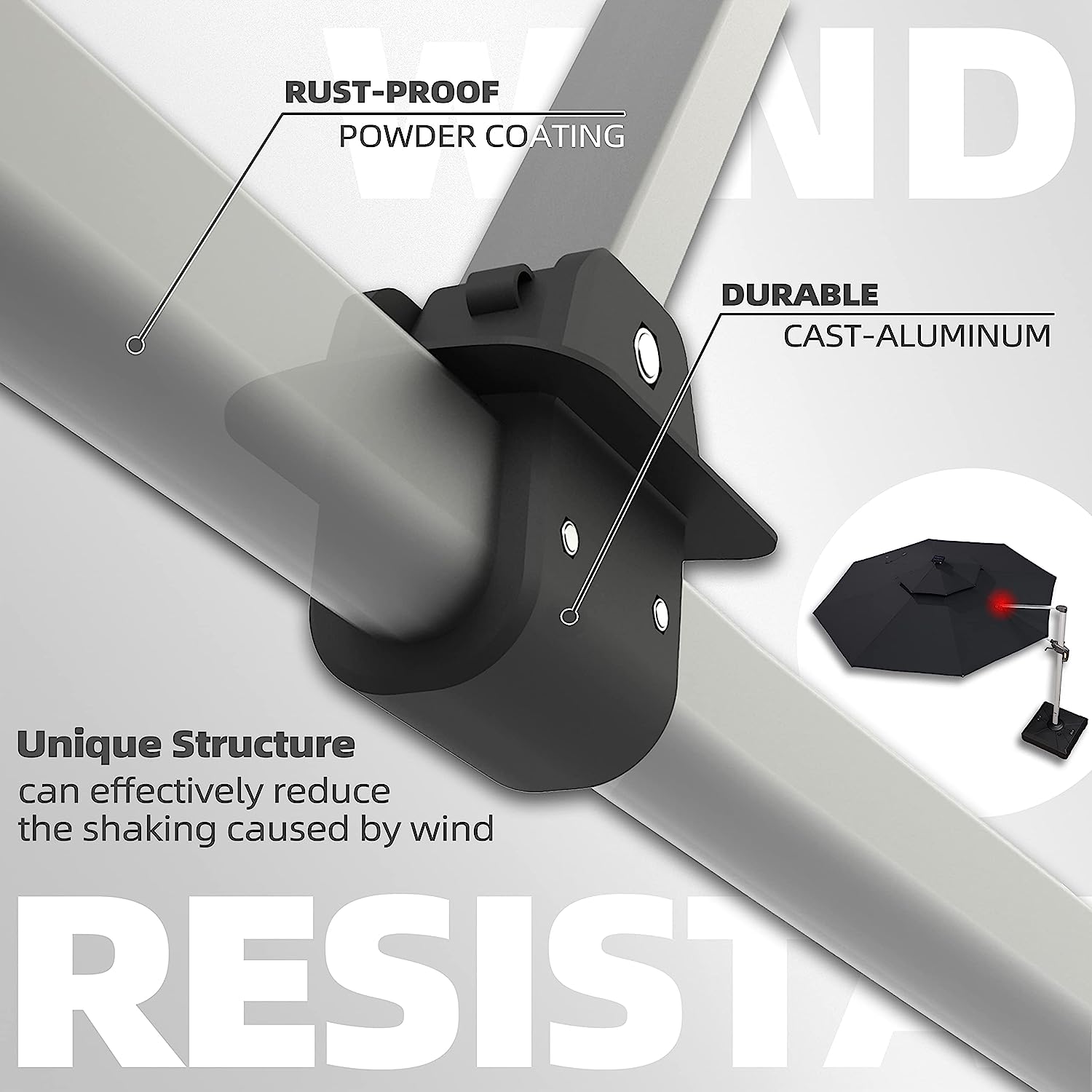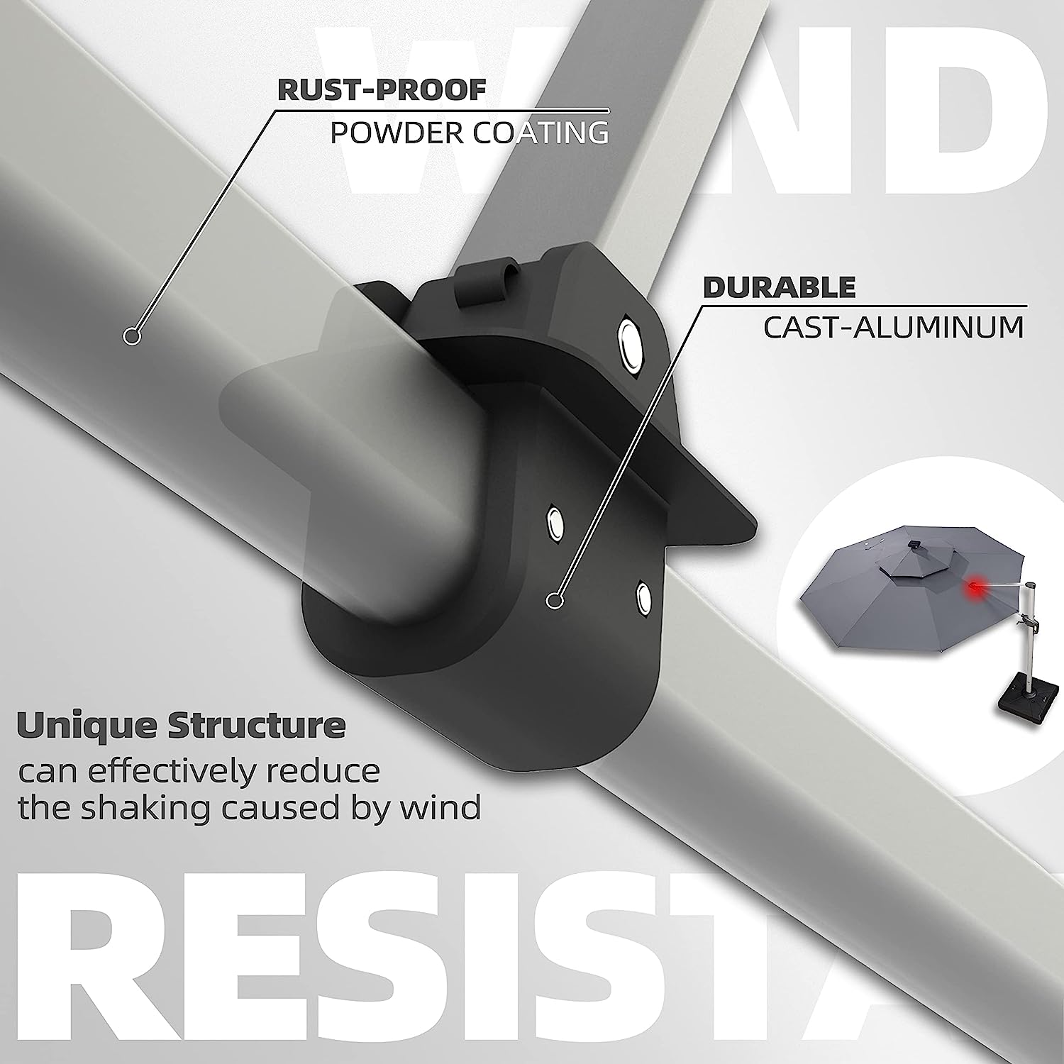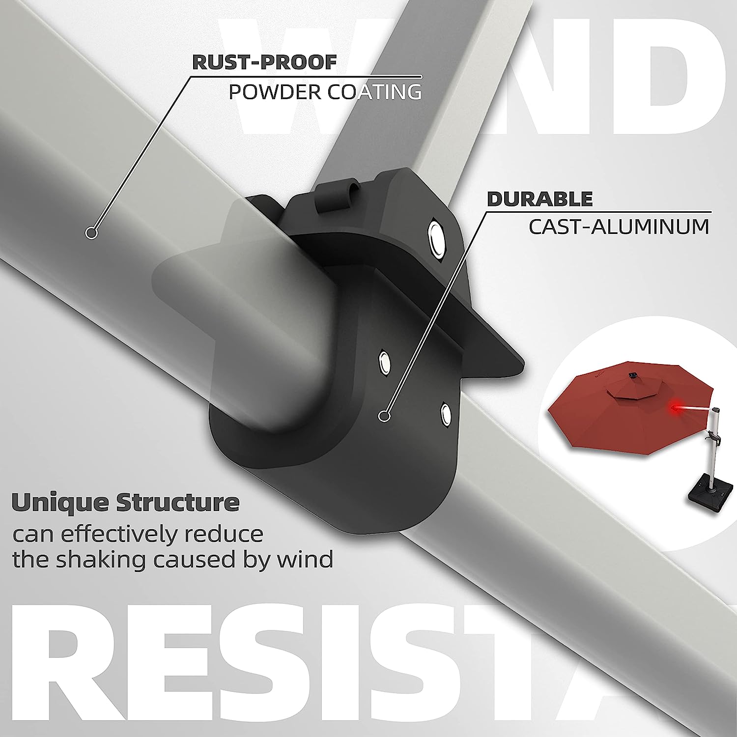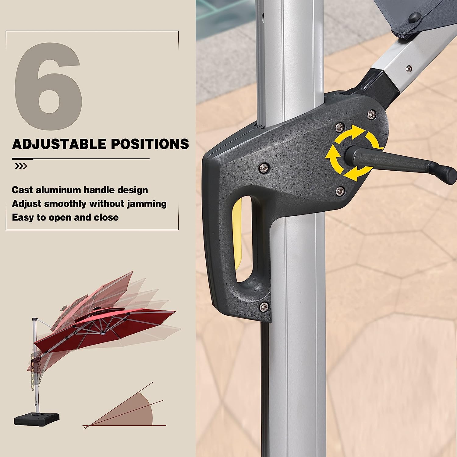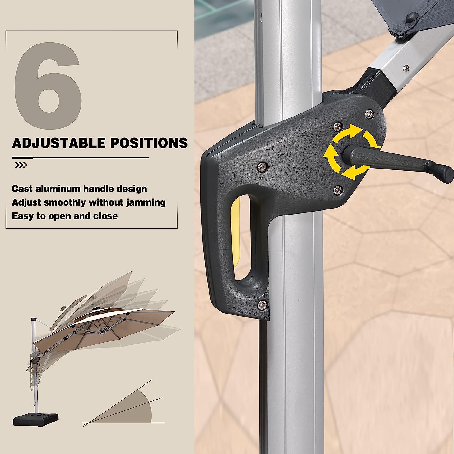 - This cantilever umbrella has unique handle design and crank system. 6 height and angles to choose. 360-degree rotation for easier shading area control