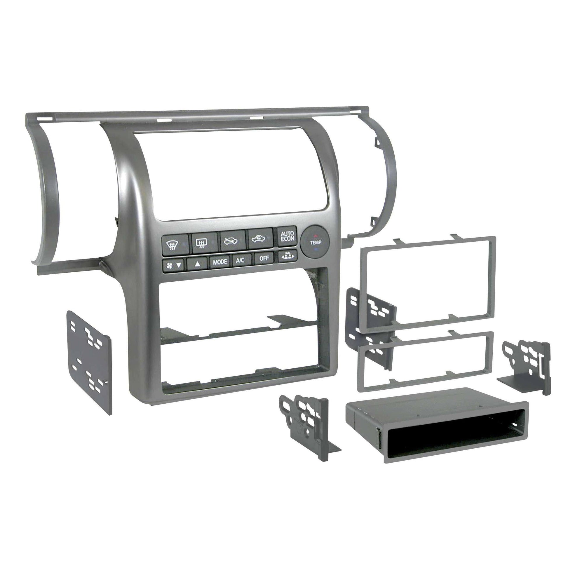 This dash kit allows for the installation of an aftermarket radio into the factory dash location of 2003 2004 Infiniti G35 models. From our expanded online assortment; not available in all Buy stores Compatible with select vehicles Allows installation in 2003 2004 Infiniti G35 models. Ensure proper installation Of replacement or upgrade in-dash decks. Supports 1 double DIN or 2 single DIN components. Custom design With recessed DIN opening allows retention of the factory air vents in their original location. Replaces entire climate control panel While retaining functionality of system. Snap-in ISO support system For simple. secure installation. Contoured and painted silver To match your vehicles dashboard. High-grade ABS plastic material For durability.