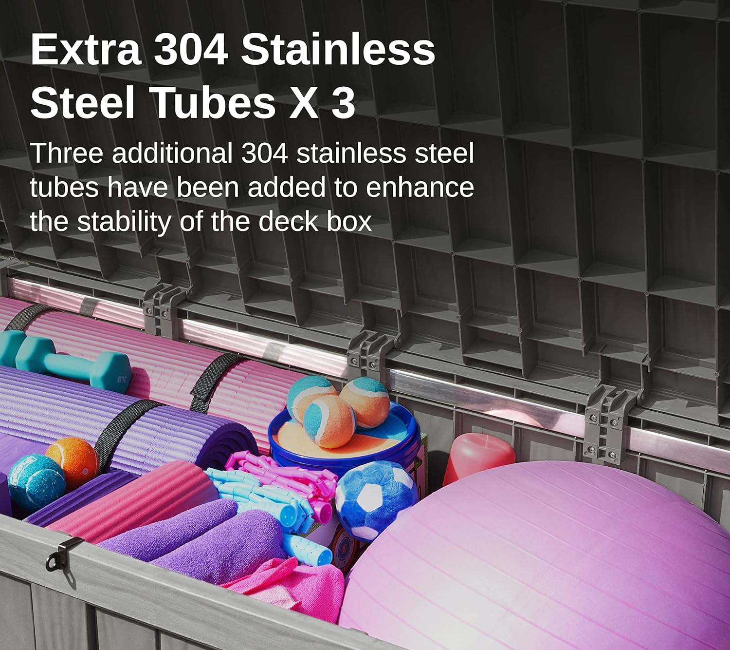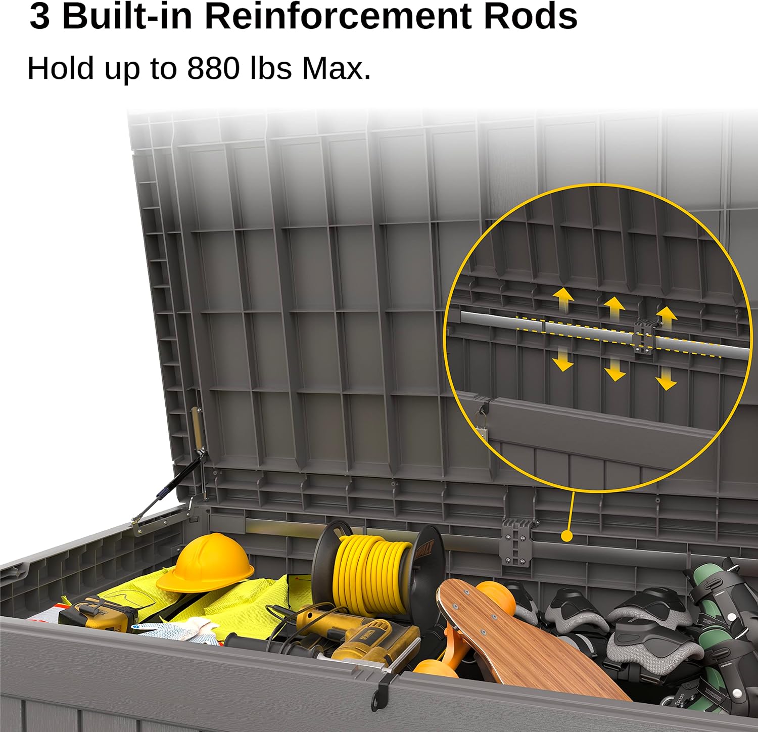 - Excellent Load-bearing Ability: The EAST OAK 230 gallon deck box has built-in three reinforcing rods to ensure that the deck box can carry heavy items without bending or warping under pressure.