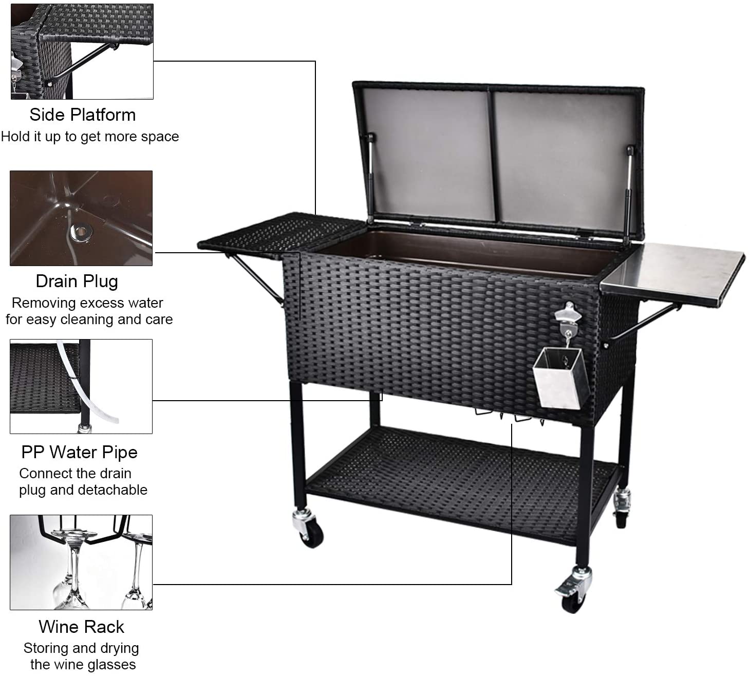 80 Quart Rattan Rolling Cooler Cart, Portable Wicker Cooler Trolley, Backyard Party Drink Beverage Bar