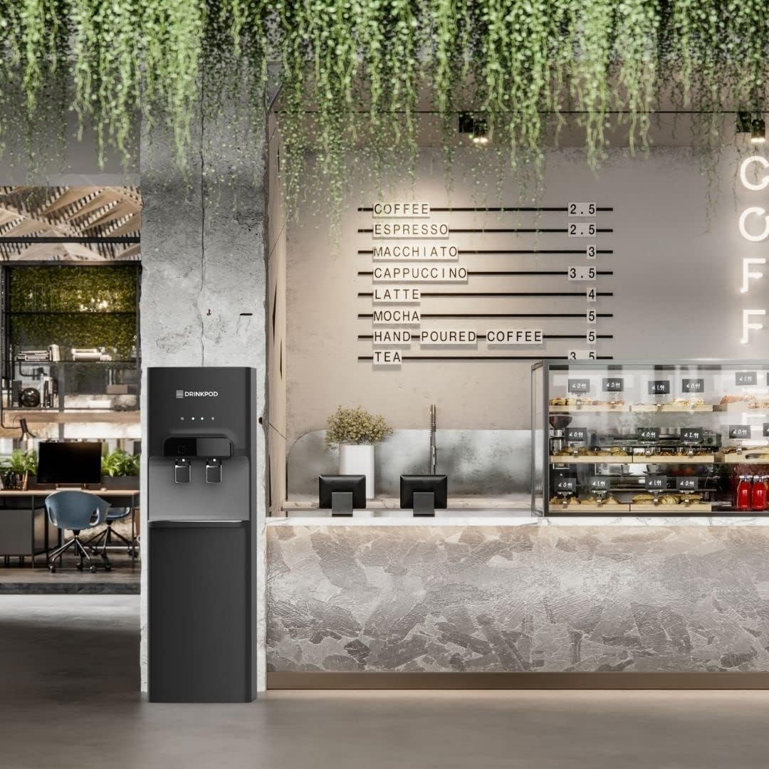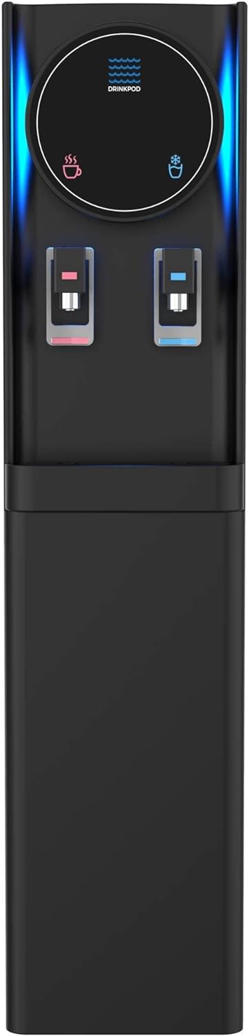 The Drinkpod 6 Series Bottleless Water Cooler Dispenser is slim and attractive and features a unique blue led accent light. that will add a beautiful touch to any home or office setting. With two independent temperature modes. this water cooler is outfitted to meet and exceed all your drinking needs. From a piping hot cup of Chai tea. or a crisp refreshing glass of chilled delicious water. every drop from the water cooler dispenser will leave you wanting more. The Drinkpod Pro Series 6 Water Cooler connects to an existing water line to supply delicious fresh pristine water though its ULTRA +3 Pod technology contained inside a magnetic door in the water cooler dispenser A complete installation kit is included with a detailed easy to read manual and illustrations to get you set up in less than 30 minutes. The Drinkpod Bottleless Water Cooler is also equipped with a bonus Ice/Café Connect and can provide refreshing delicious water for up to 2 additional appliances like your ice-maker and coffeemaker. Dimensions: 10.24 W x 17.72 L x 43.7 H