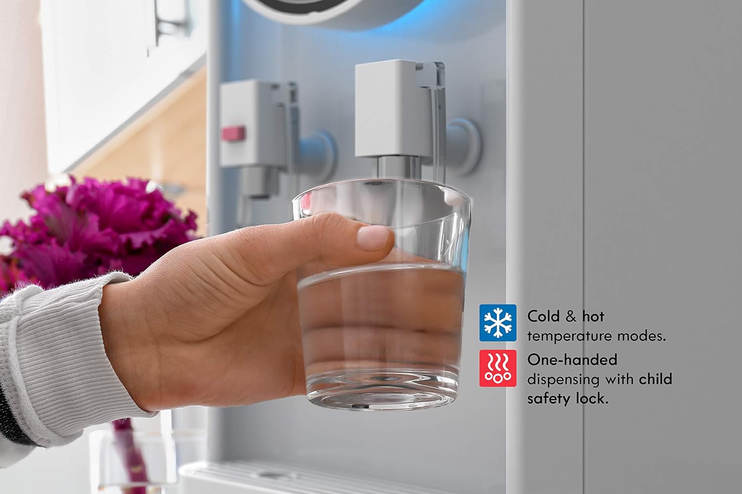 - TOUCHLESS: The Water Cooler features mechanical control paddles for both cold and hot temperature modes (with child safety lock). encouraging the user to dispense water by pushing the lever with a cup and avoid using hands to dispense water.