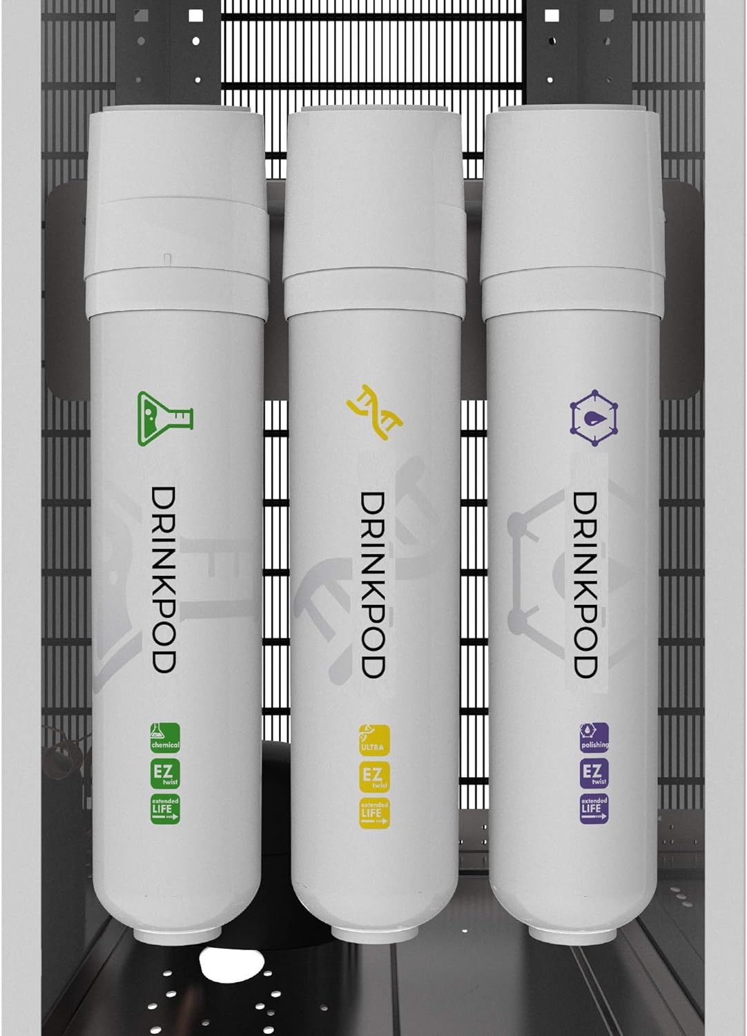 - ULTRA 3+ ADVANCED PODS: Concealed within the Drinkpod Water Dispenser cabinet are three dedicated cartridge pods that make up the ULTRA advanced system. One set of these extended life pods will last an entire year for the average office or household. Replacement is as simple with the EZ-twist mounting system.