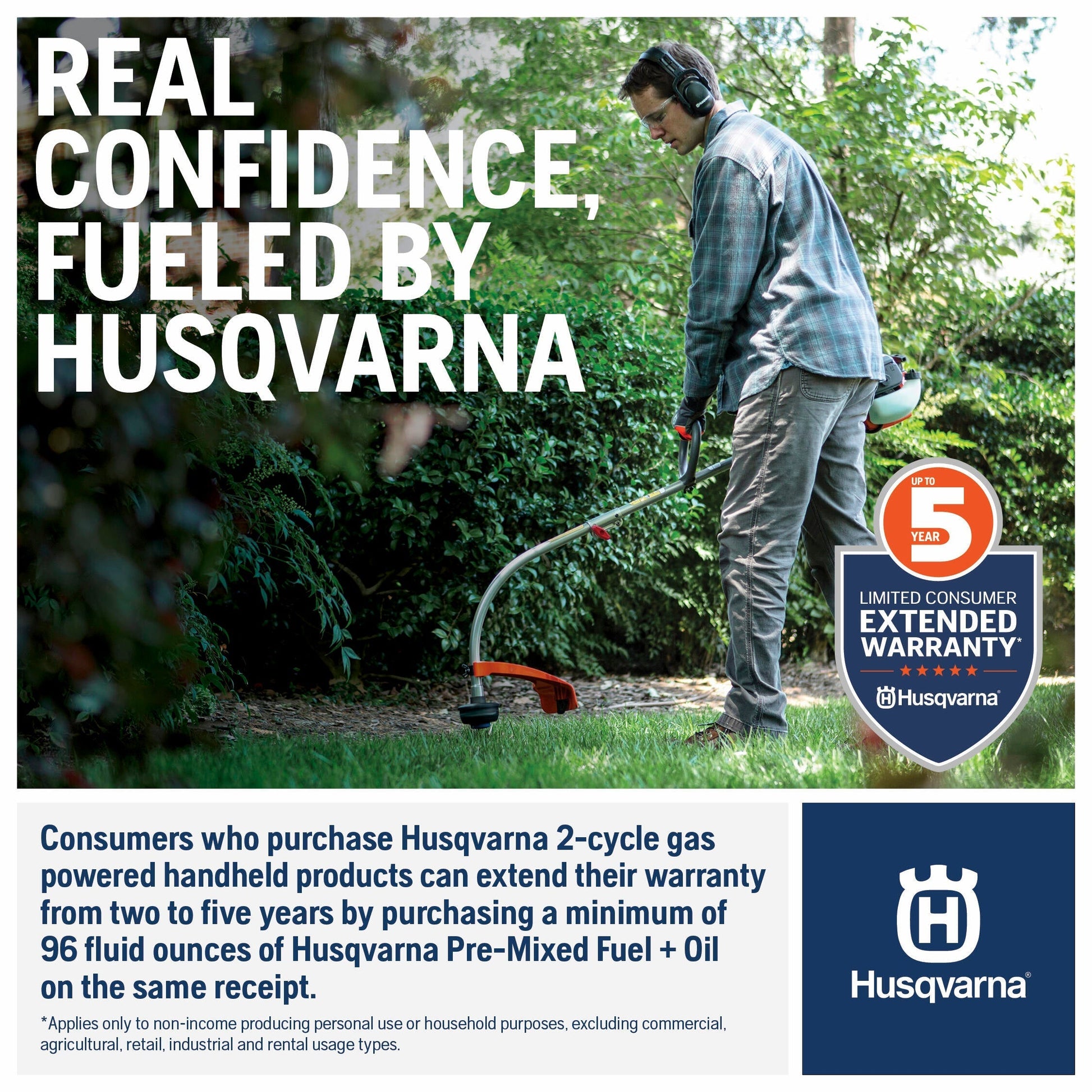 Power through yard work with the Husqvarna 128LD Gas String Trimmer. Perfect for homeowners. this lightweight. multipurpose straight shaft string trimmer features a 17-inch cutting width to let you tackle more area in less time. The straight shaft design is ideal for hard-to-reach spots like under bushes or decks. For easy starting. this gas weed eater features a fuel pump. Smart Start Technology and Air Purge. which removes air from the carburetor and fuel system for an effortless start-up. An auto return stop switch automatically resets to the "on" position to further streamline the starting process. Plus. this gas weed wacker comes equipped with a strong. braided trimmer line and a T25 semi-automatic trimmer head for easy loading. A detachable shaft makes it simple to store and transport this Husqvarna weed eater with any law. This gas powered weed eater is compatible with several click-on attachments. allowing you to transform your Husqvarna trimmer into a variety of landscaping tools. The Husqvarna 128LD Gas String Trimmer is backed by a 2-year limited warranty for homeowner use and up to a 5-year limited warranty when you purchase the trimmer and 96 fluid ounces of pre-mixed fuel.
