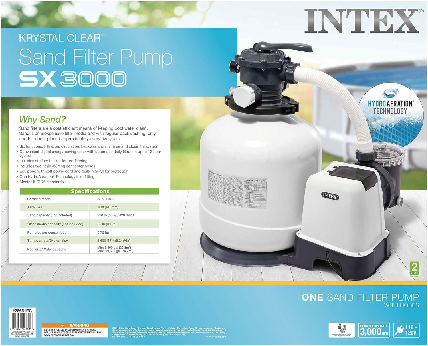 Intex 26651EG Krystal Clear 16 Inch 3,000 GPH Above Ground Pool Sand Filter Pump with Automatic Timer, GFCI, and 6 Function Control, Gray