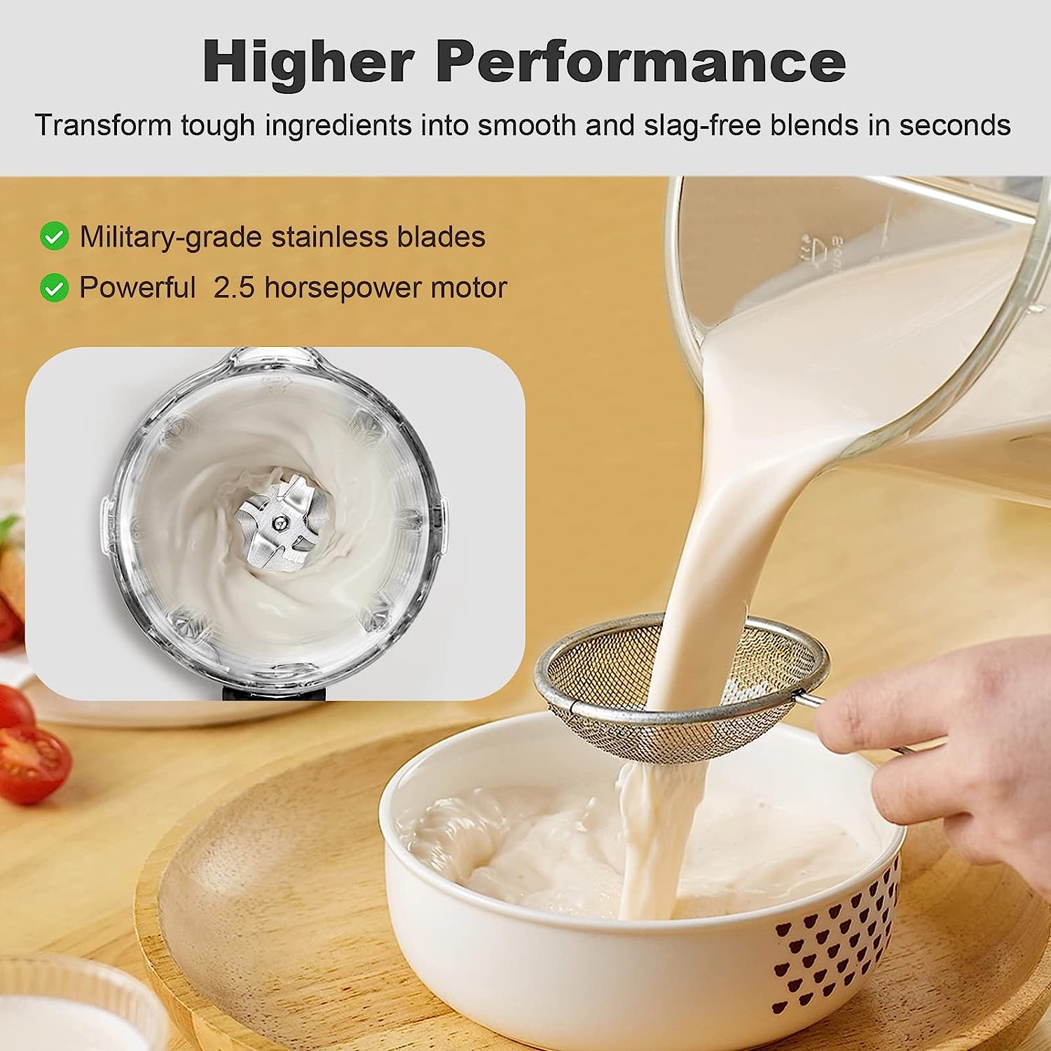 - 🍒Strong Power Juicer: The food processor blender is equipped with military-grade 4-bladed laser stainless steel blades. super sharp and sturdy to handle the toughest ingredients. With a 2.5 horsepower high-end motor. the high speed blender reaches a speed of up to 35000RPM. can break the cell walls instantly. fully releasing the nutrients and giving you a more delicate taste. The quiet blender comes with a thicken professional soundproof cover(6mm). can effectively reduce 40% of noise.