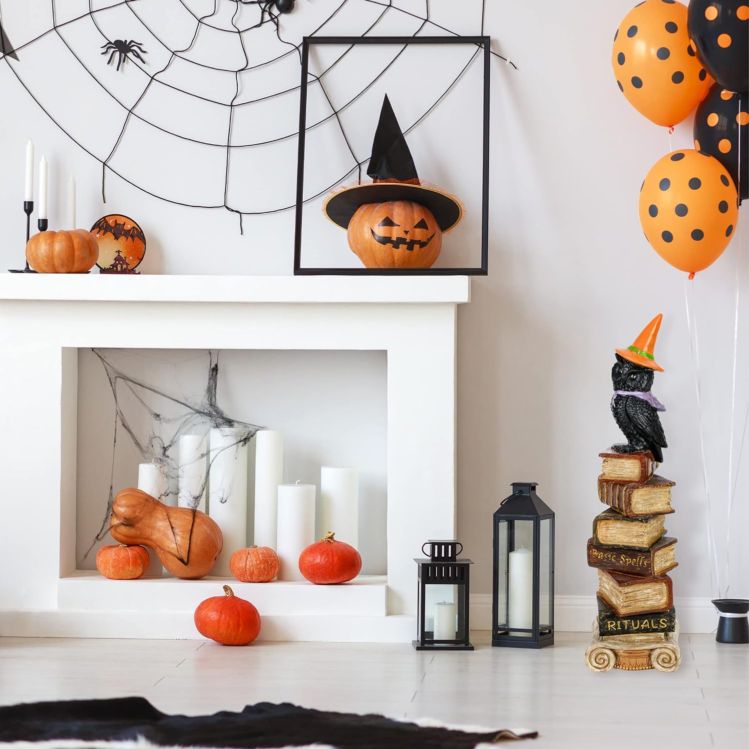 - This harrowing Halloween table decoration features a black owl wearing a purple scarf and an orange witch's hat perched warily atop a stack of thick volumes of magic spells and rituals that rest on an ornate pedestal base