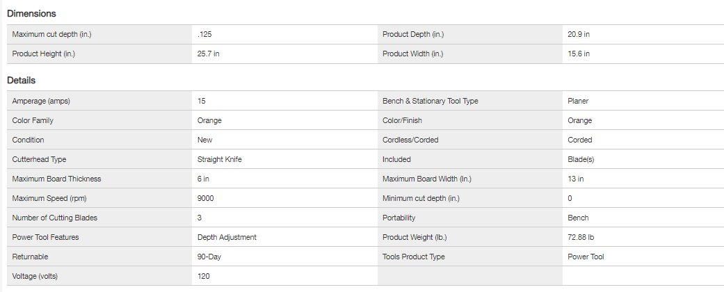 - Includes: 13 in. Thickness Planer. Depth Adjustment Handle. Dust Port. Magnetic Blade Wrench. Switch Key. and Operators Manual